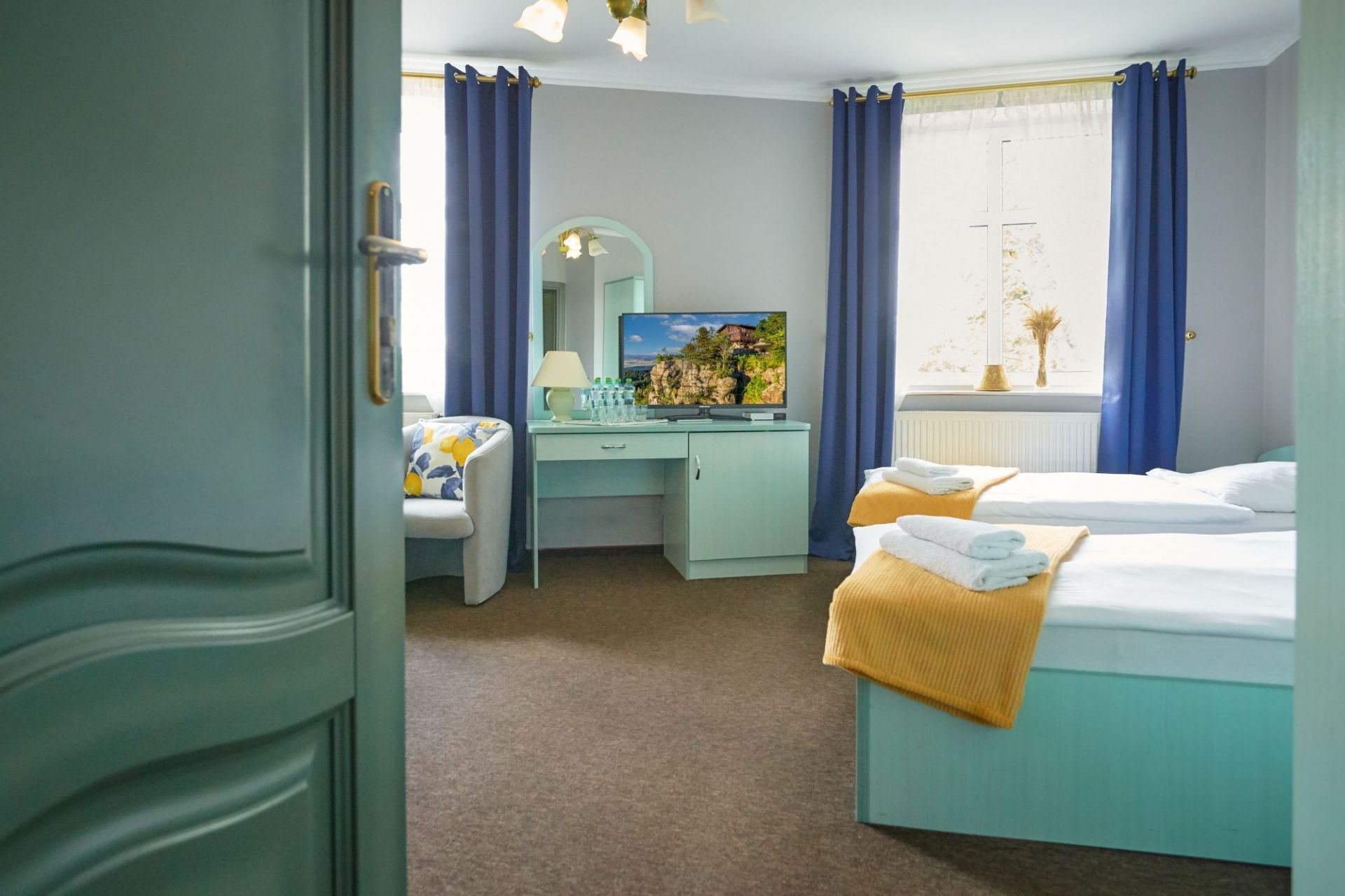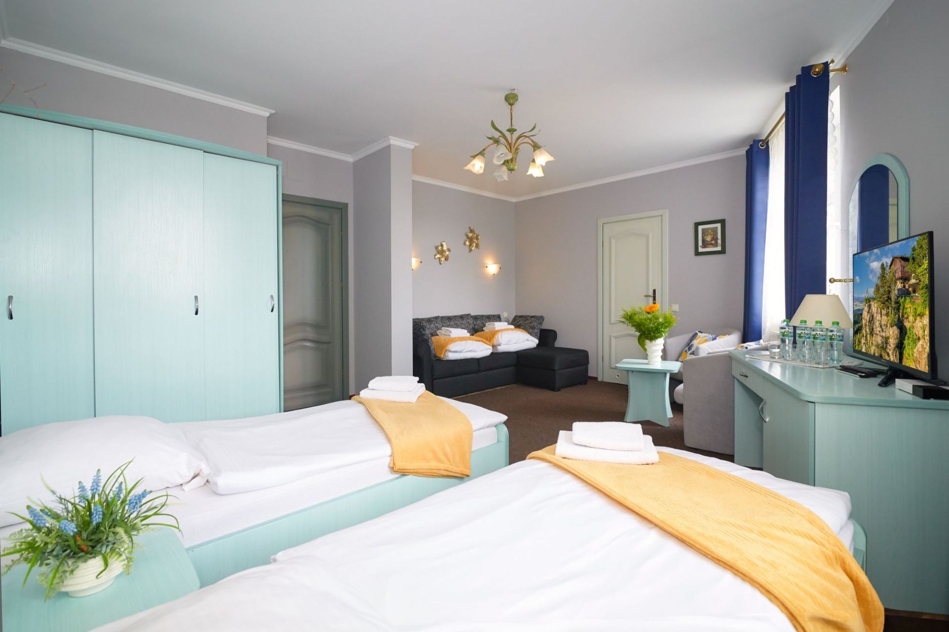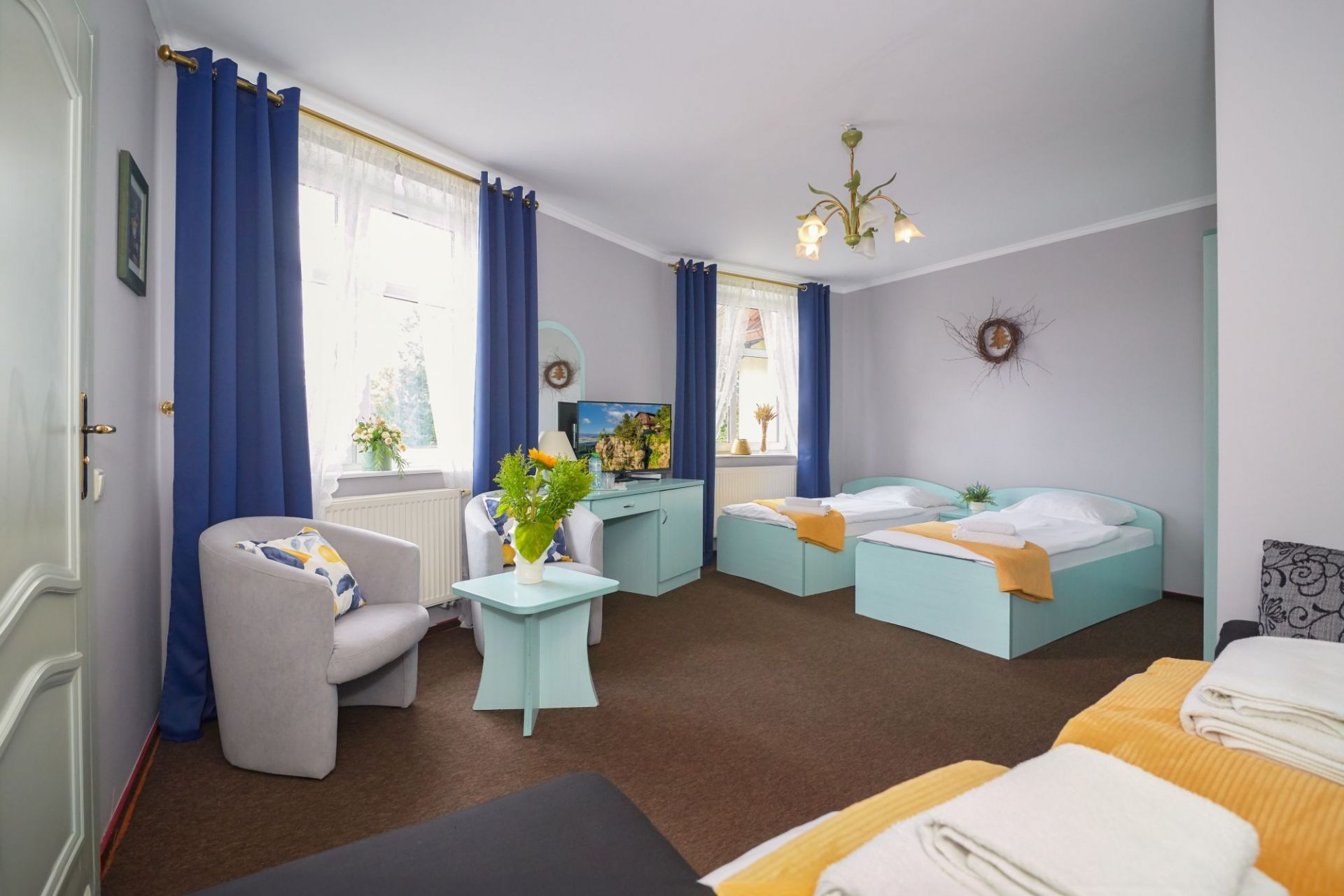 Pokój komfort dla 4 osób z łazienką wyposażoną w wc, kabinę prysznicową, suszarkę do włosów, mydło, ręcznik. W pokoju TV. Powierzchnia pokoju z łazienką ok 30 m kw. W pokoju łóżko małżeńskie oraz dwa łóżka pojedyncze. Na terenie obiektu WiFi zabezpieczone hasłem. Parking obok obiektu